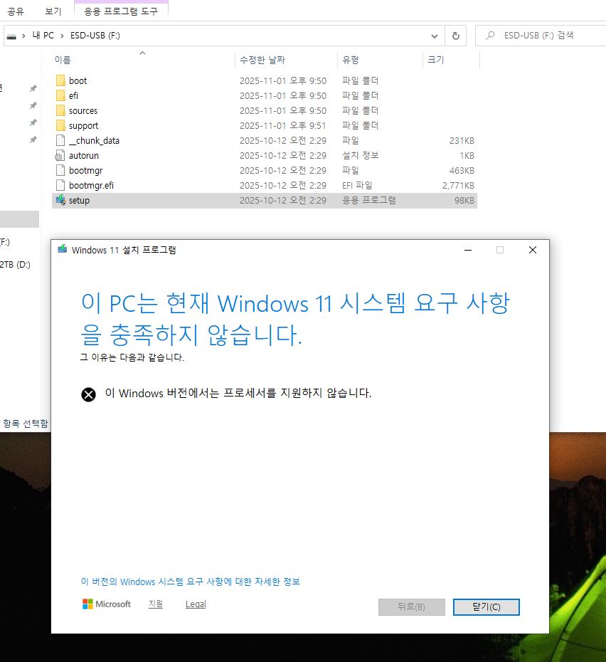 알려주신 방법으로 지난주에 USB에 설치 미디어를 만들어 셋업프로그램을 실행했었는데 붙임과 같은 오류메세지가 떳습니다.